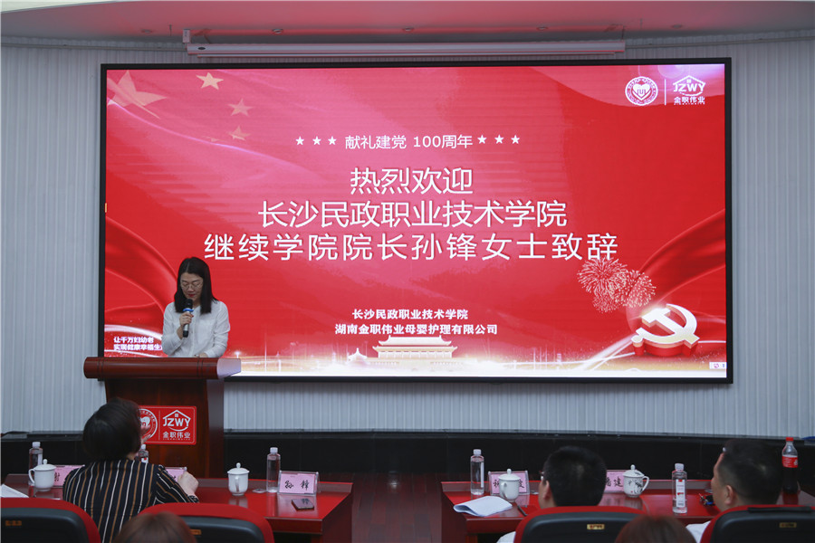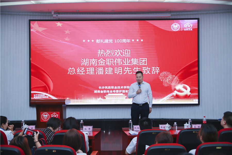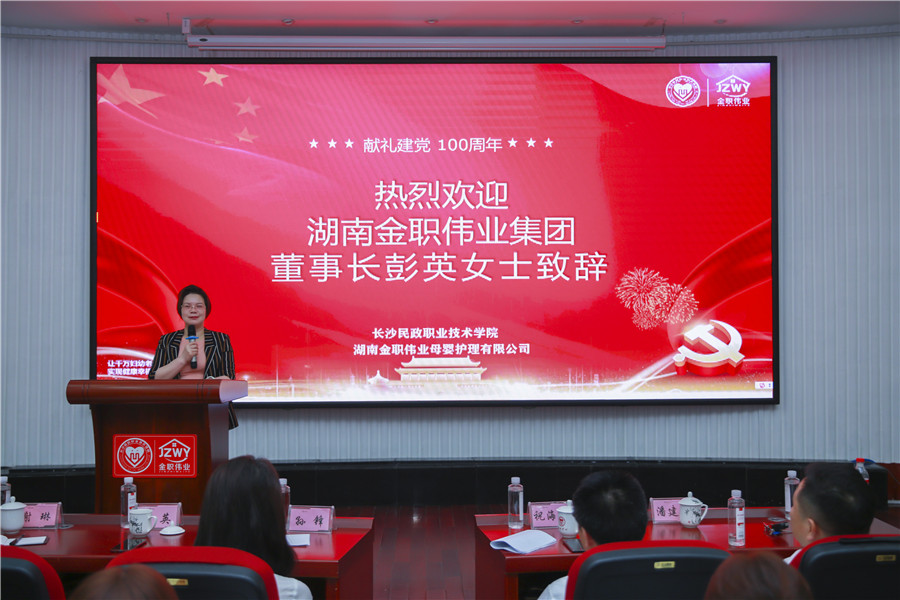 湖南金職偉業集團董事長彭英發表講話。彭英強調,金職偉業作為教育部1+X第三批幼兒照護職業技能等級證書職業教育培訓評價組織,將著力做好以下三點:一是,繼續發揮好行業龍頭企業的示范引領作用,帶動更多托育、兒童保健、學前等領域企業規范發展、規模發展、質量發展;二是,不遺余力地推動1+X幼兒照護職業技能等級證書制度落地,推動幼兒照護職業技能等級證書成為行業用人準入的重要依據;三是,號召有條件、有需求的企業多拿出一些資源對學生群體加強就業、創業扶持,幫助他們更好地發展。