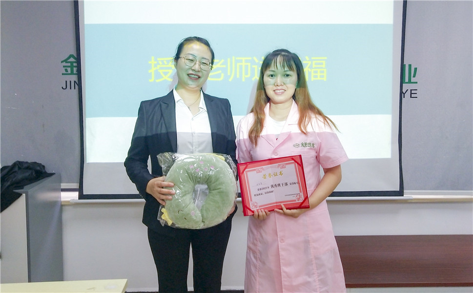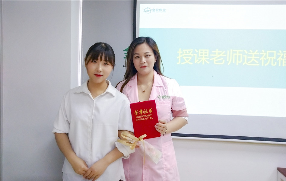緊接著,陳萬方副校長、舒華老師為本期學員向美蓉、熊元秀頒發“優秀班干部”“優秀學員”證書。“選擇金職偉業是正確的,剛來時我特別不自信,但經過老師們的悉心教導,我學到了很多專業知識和技能,同時,也了解到母嬰行業廣闊的發展前景,增強了對未來信心,謝謝金職偉業。”班長向美蓉說道。