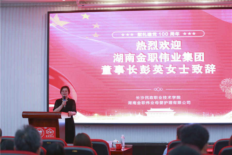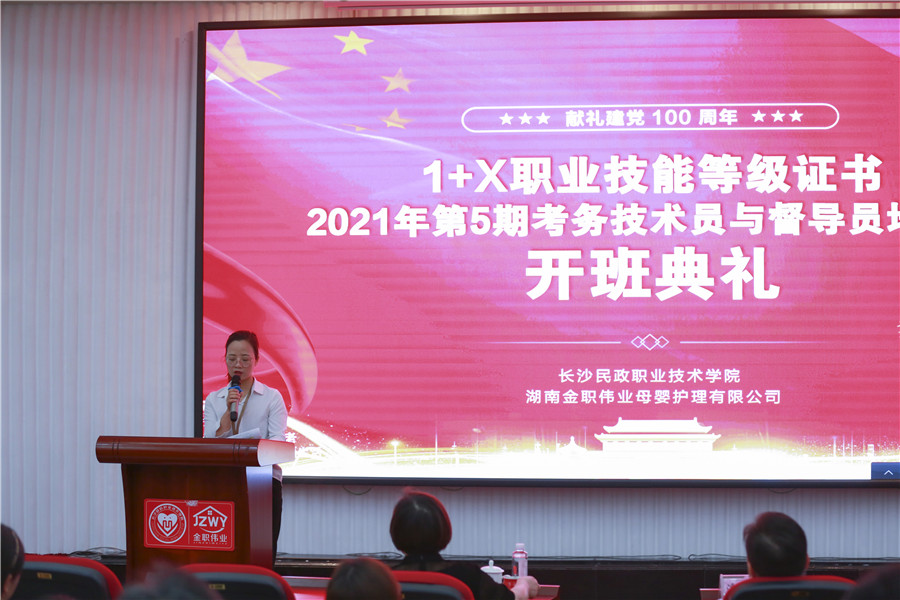 典禮上,金職偉業董事長彭英進行致辭。首先,她對每位老師的到來表示親切問候和熱烈歡迎,“非常感謝老師們對金職偉業的鼎力支持,培訓期間,金職偉業將盡心盡力做好大家的服務工作,確保老師們順利完成培訓任務。”彭英表示,本次培訓課程內容充實,授課質量高,希望各位同仁能靜心學習,全面掌握考務技術與督導員的工作職責和各項流程的操作,加快1+X幼兒照護、產后恢復職業技能等級證書在各大院校的落地。