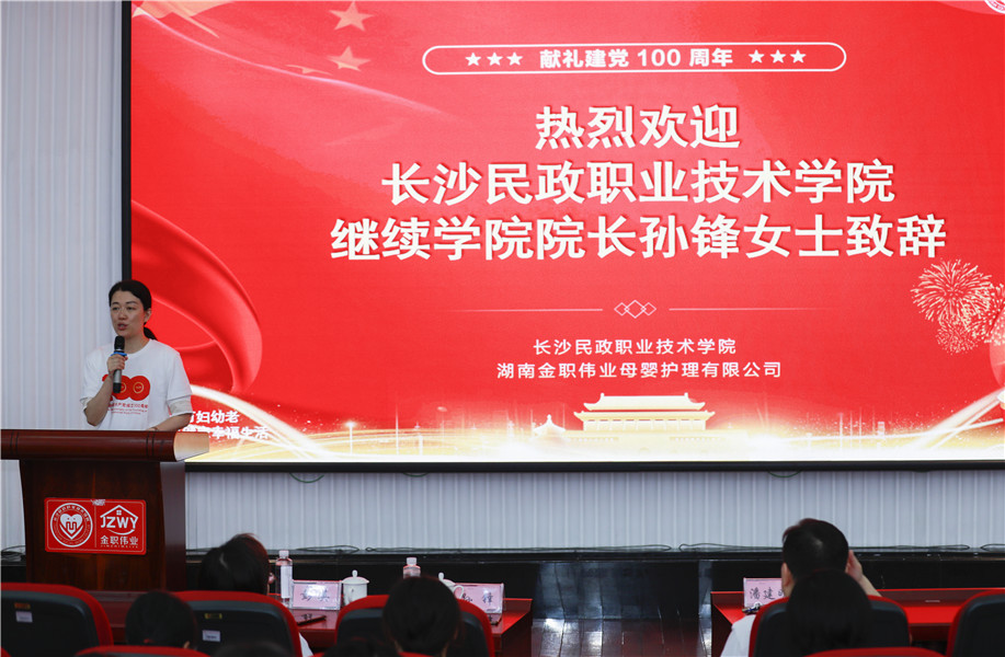 典禮上,長沙民政職業技術學院繼續教育學院院長孫鋒率先進行致辭。她提到,黨和政府大力支持職業教育的發展,并發布了一系列配套政策加以扶持,作為職業院校應抓住機遇,加快推進人才培養模式的改革。孫鋒希望,在座老師能認真學習交流,為推動職業教育發展做出重要貢獻。金職偉業董事長在講話中提到,“衷心歡迎各位老師的到來,金職偉業將堅持信心、匠心、責任心、耐心和忠心的五心育人理念,不斷推動幼兒照護行業的發展,為社會輸送更多高質量、高素質的技術技能型人才,為國家職業教育事業添磚加瓦。”