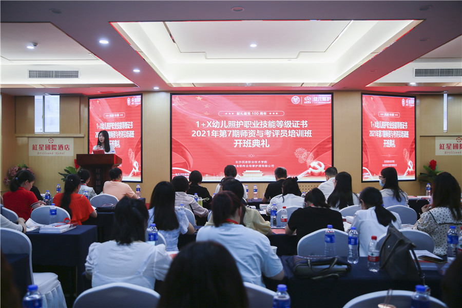 為扎實推進1+X幼兒照護職業技能等級證書試點工作,提升職業院校學前、早教等專業教師教學能力及實踐技術技能水平,6月28日上午,1+X幼兒照護職業技能等級證書2021年度第七期師資及考評員培訓在湖南長沙正式開啟,來自全國各大院校的近百名專家、老師齊聚一堂,共同學習幼兒照護專業知識及技能。