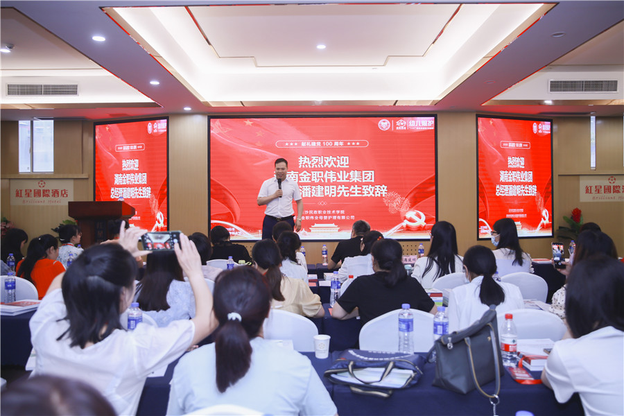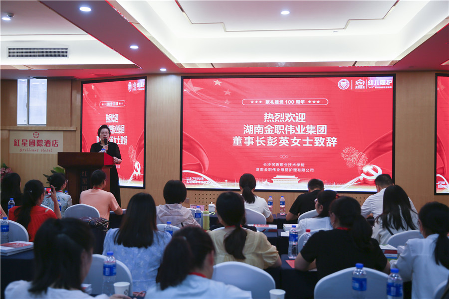 長沙民政職業技術學院繼續教育學院孫鋒院長在講話中提到,作為職業院校應抓住機遇,加快推進人才培養模式的改革,并深入研究幼兒照護職業技能等級標準在課堂教學、課程標準制定、教材研發等方面的融入方式。金職偉業董事長彭英對各位領導、專家老師的到來致以崇高的敬意并表示熱烈歡迎,她強調,金職偉業作為教育部1+X第三批幼兒照護職業技能等級證書職業教育培訓評價組織,將繼續發揮好行業龍頭企業的示范引領作用,不遺余力地推動1+X幼兒照護職業技能等級證書制度落地,推動幼兒照護職業技能等級證書成為行業用人準入的重要依據。