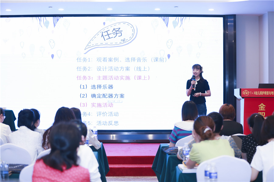特別的是,為深入貫徹落實《國家職業教育改革實施方案》,引導學校和教師以立德樹人為根本任務,推進“三全育人”,落實“課程思政”要求,1+X幼兒照護職業技能等級證書2021年第八期師資及考評員培訓班舉辦了一場教師教學能力競賽。據悉,此次競賽融入國家教學能力大賽標準,以造就黨和人民滿意的高素質、專業化、創新型教師隊伍為宗旨,以支撐新時代職業教育改革、實現職業教育現代化、提高技術技能人才培養質量為導向,以團體競賽為主要形式。在比賽過程中,全體學員劃分為9個小組,各參賽小組充分利用13分鐘的講解展示時間,以“心肺復蘇”“七步洗手法”“奧爾夫音樂教育活動實施”“氣管異物的處理”等為主題,借助PPT、視頻等方式開展了精彩紛呈的教學。