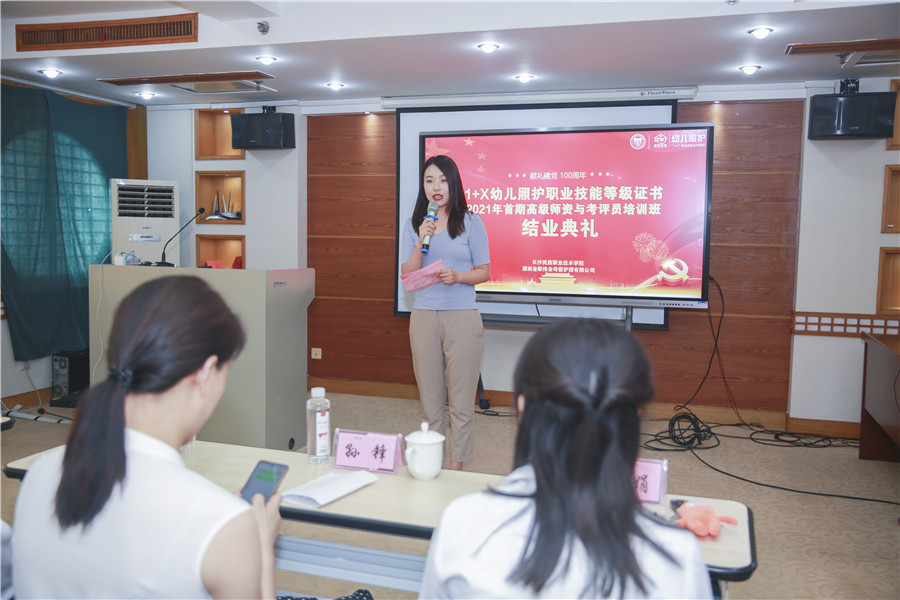 比賽結束后,1+X幼兒照護職業技能等級證書2021年度首期高級師資及考評員培訓結業典禮舉行。此次結業典禮由貴陽幼兒師范高等專科學校教師時瑤主持,長沙民政職業技術學院繼續教育學院院長孫鋒,金職偉業董事長助理兼品牌運營總監周娟、市場總監周該生、商學院院長陳萬方等出席并發言。