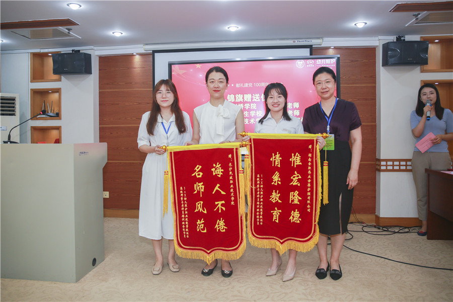 緊接著,哈爾濱劍橋學院教師白詩萌、吉林省四平衛生學校教師楊光昊為長沙民政職業技術學院和金職偉業贈予錦旗,錦旗鮮紅,數語寥寥,卻情深意重。與此同時,還評選了一批優秀班干部、優秀學員。四川省華鎣職業技術學校教師游伶、吉林省四平衛生學校教師高文芝分別作為學員代表分享獲獎感言。他們均表示,本次培訓全方位地展示了深化職教改革背景下1+X職業技能等級證書改革試點工作的深遠意義,讓大家對于完善人才培養方案,深化三教改革,校企合作,崗、課、賽、證的融通,幼兒照護高級核心技能考評標準的精準解讀,有了更深刻的認識,為今后開展1+X幼兒照護職業技能等級證書落地工作打下了堅實基礎。