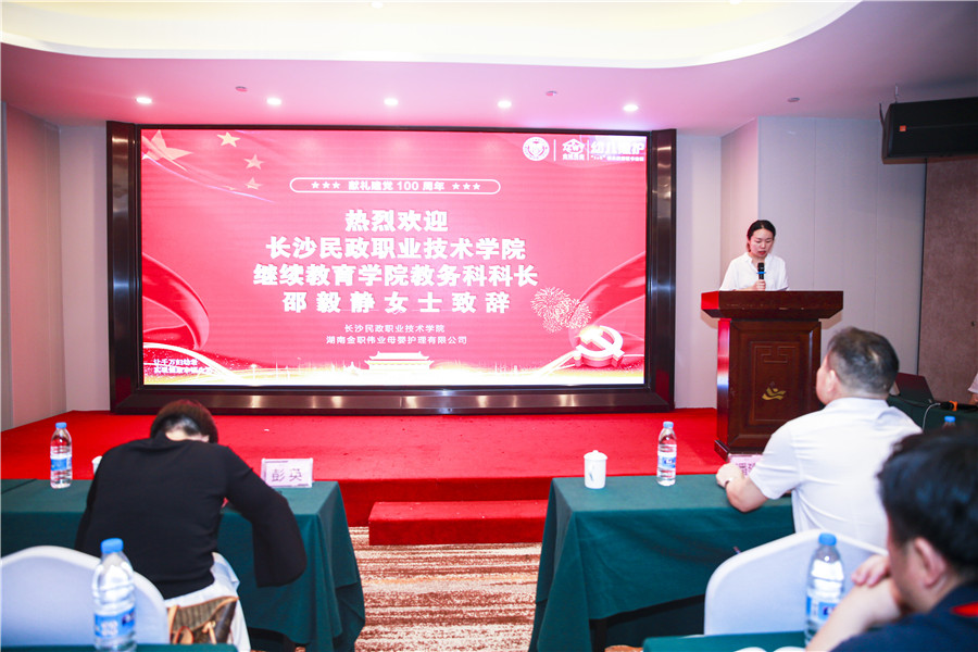 典禮伊始,長沙民政職業技術學院繼續教育學院教務科科長邵毅靜、金職偉業董事長彭英發表致辭。邵毅靜對在座老師的到來表示熱烈歡迎,對全體工作人員的辛勤付出表示衷心感謝。同時她提到,國家高度重視幼兒照護等社會服務領域人才的培養,在座老師應牢牢把握此次培訓機會,認真學習交流,全面掌握幼兒照護相關知識,為推動職業教育發展做出重要貢獻。金職偉業董事長彭英強調,在國家教育、人才產業政策的大力支持下,托育托幼行業迎來了發展的春天,希望能與各位同仁共同探討、共同踐行,真正實現學生好學、老師好教、企業好用的幼兒照護證等級證書的目標。