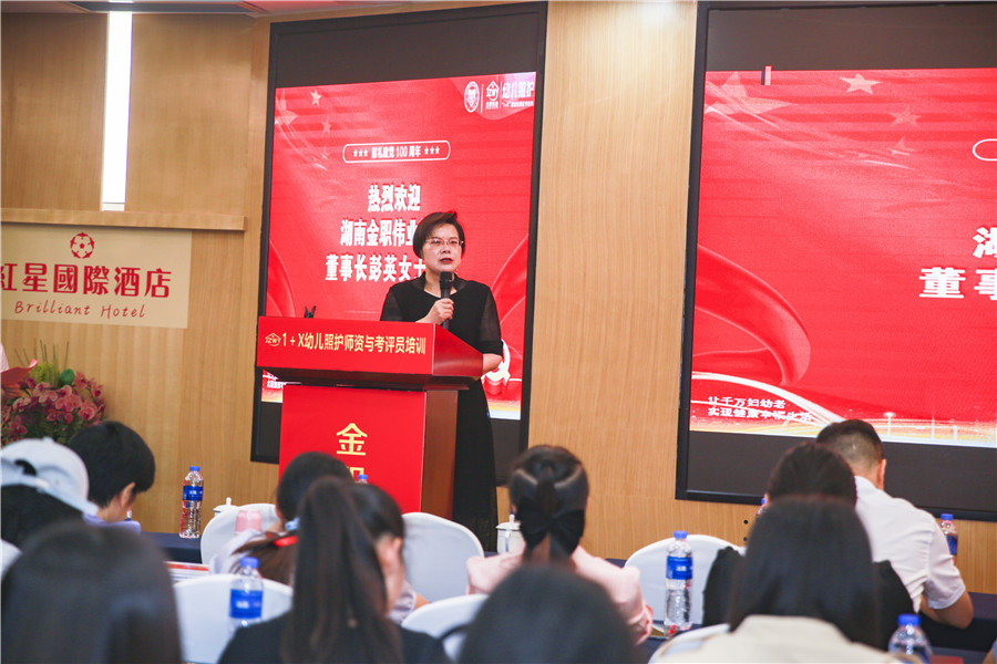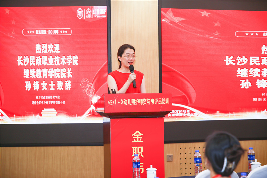 開班典禮上,長沙民政職業技術學院繼續教育學院院長孫鋒、金職偉業董事長彭英率先發表致辭。孫鋒院長提到,國家高度重視幼兒照護等社會服務領域的人才培養,推動幼兒照護領域1+X證書制度落地,在教育、人才、產業方面,發布了一系列配套政策,作為職業院校應抓住機遇,加快推進人才培養模式的改革;一線教師應該深入研究幼兒照護職業技能等級標準,在課堂教學、課程標準制定、教材研發等方面融入標準,讓學生能牢固掌握此項技能,為將來適應職業崗位需求做好準備。彭英董事長從國家政策、1+X證書工作成果、未來發展等多方面進行了系統的講述,其中重點提及,作為1+X證書制度試點的第三批職業教育培訓評價組織,金職偉業將不遺余力地推動1+X幼兒照護職業技能等級證書制度落地,推動X證書成為行業用人準入的重要依據,同時充分發揮幼兒照護職業技能等級證書對學校、企業、行業、社會的作用,多措并舉構筑婦幼人才高地。