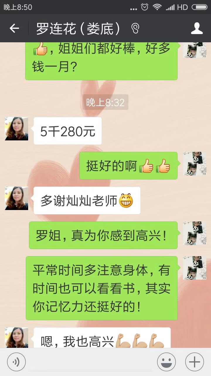 在學習過程中,羅姐姐接受能力強,學習能力強,一直保持一顆上進的心態,為人和善,收到了一眾老師的好評。學校畢業后,羅姐姐進入榮軍醫院進行實習,在實習過程中,羅姐姐一直在跟產婦交流,分享自己的所學知識以及自己的經驗,備受產婦們的信任,并且建立了聯系,畢業后肖姐姐及時回訪這些產婦,產婦們也對肖姐姐十分滿意?;仡^顧客多,為羅姐姐的就業提供了更多渠道。