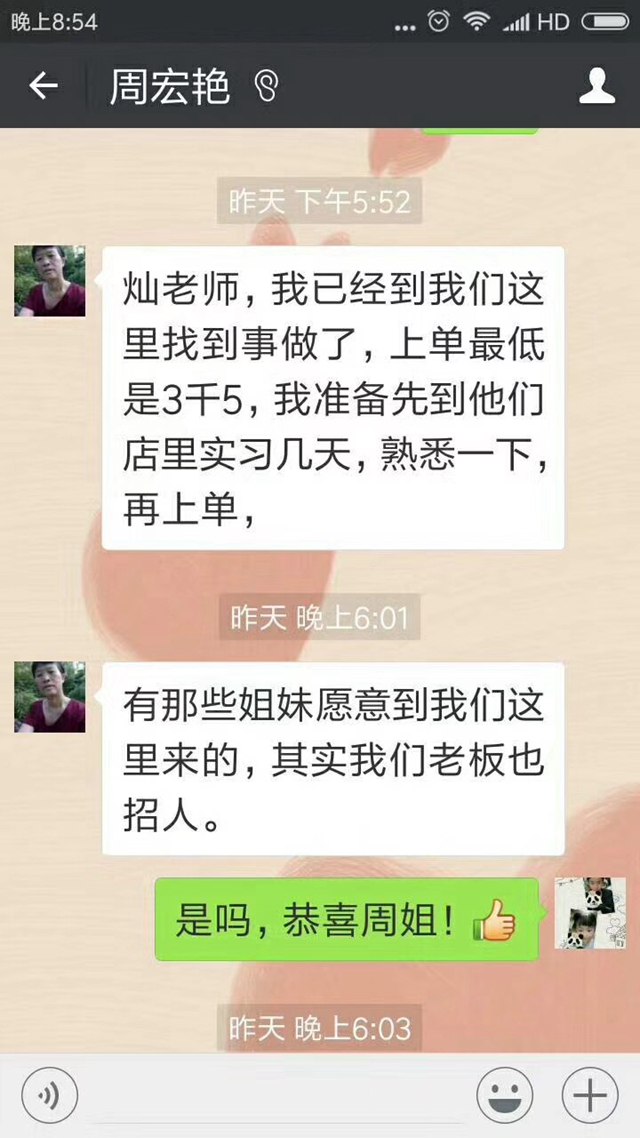 學習期間周姐姐非常認真,也是非常愛跟授課老師聊天,每天都會在朋友圈分享自己學到的小知識,并且也在學習期間自己觀摩整個行業,在剛剛畢業的時候一家月子會所就看中了周姐姐,經過面試后周姐姐應聘成功,成為該月子會所的一名月嫂。