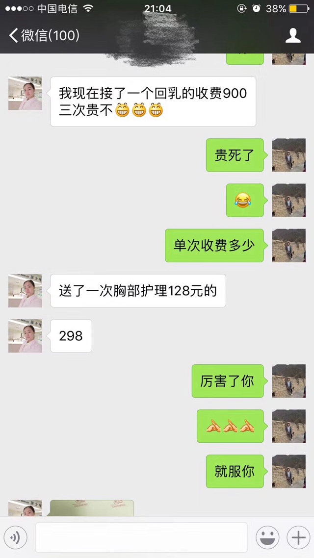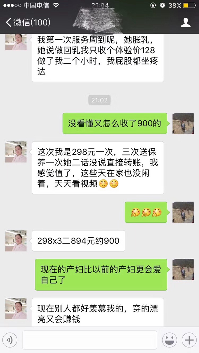 經(jīng)過多方對比后,她選擇了金職偉業(yè)進行催乳師培訓(xùn),張姐姐大方爽朗的性格獲得了學(xué)員和老師的青睞。畢業(yè)后張姐姐開始開拓市場,通過朋友圈的日常知識分享,以及發(fā)放名片的方式,張姐姐成功接到了第一單900元3次催乳服務(wù),并贈送了一次胸部護理服務(wù),一開始客戶其實也是對張姐姐的技術(shù)有所質(zhì)疑的,張姐姐自己說:“我第一次服務(wù)非常周到的,她脹乳,我就給她做回乳,硬生生做了2個小時,還只收了體驗價128元,經(jīng)過第一次的服務(wù)后,之后就馬上買了三次服務(wù),二話沒說當(dāng)場轉(zhuǎn)賬。”