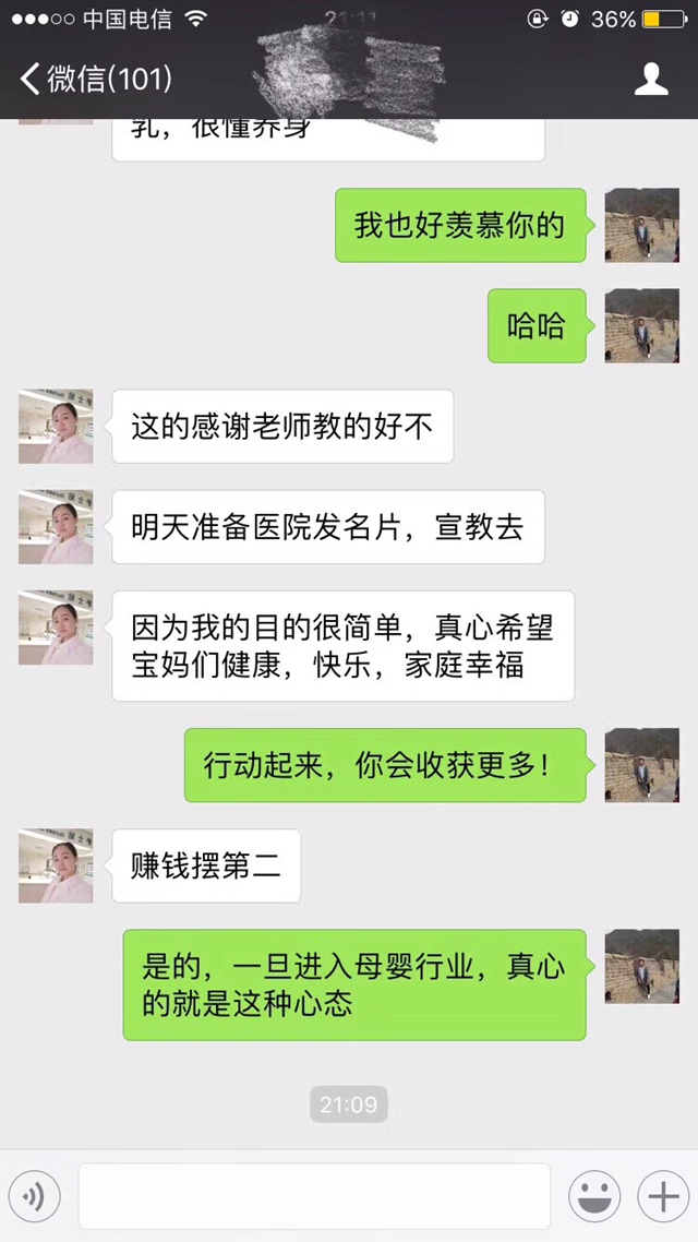 胡老師也說,其實很多學(xué)員技術(shù)很好,但是放不開,不懂營銷,連名片都不愿意發(fā)。其實催乳師不僅僅是賺錢,還能把科學(xué)的母乳喂養(yǎng)方式教給各位寶媽們,正如張姐姐所說:“我的目的很簡單,真心希望寶媽們健康,快樂,家庭幸福。”