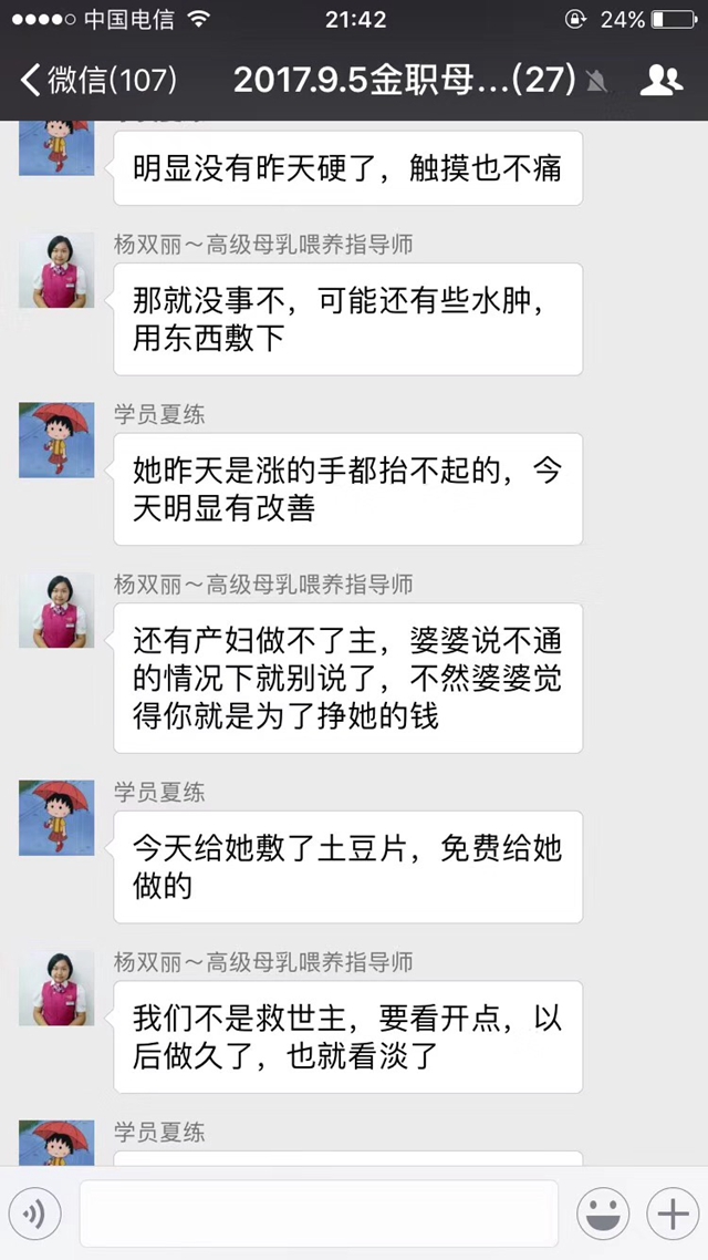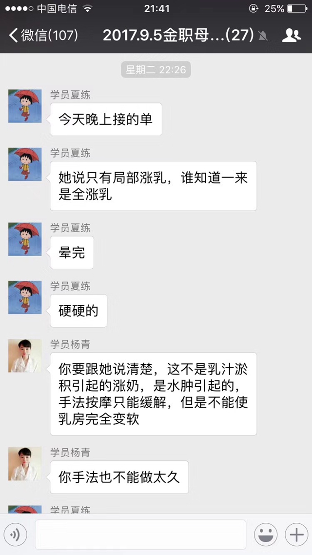 畢業后夏姐姐開始了自己接單,接到的第一單是一位產婦脹乳,一開始產婦說自己局部漲乳,夏姐姐親自去看后才發現是全漲乳,并且這還不是最大問題,最大的問題是,產婦婆婆覺得催乳并不可靠,夏姐姐沒有多說什么,而是通過幾天的治療,用事實說服了產婦婆婆,也改變了產婦婆婆的看法,之后這位產婦還幫忙給夏姐姐推薦了客戶。