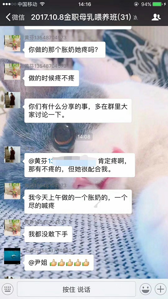 在學習上尹姐姐是非常認真的,經常問老師們關于手法的問題,并且尹姐姐能說會道,活潑開朗的性格不僅是受到了學員和老師的好評,更受到了客戶的好評,去醫院實習,產婦對尹姐姐非常滿意,還互相留了微信成了朋友。