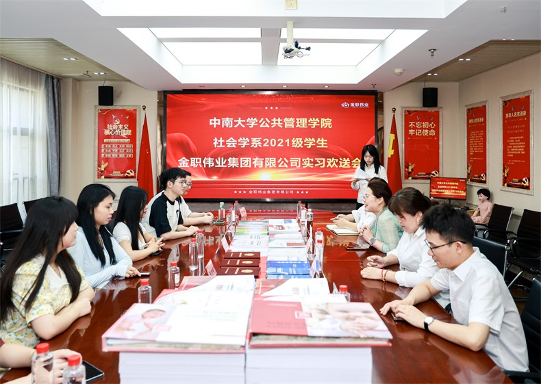 2024年7月10日,中南大學(xué)公共管理學(xué)院社會學(xué)系2021級學(xué)生專業(yè)實(shí)習(xí)歡送會在金職偉業(yè)集團(tuán)有限公司舉行。金職偉業(yè)董事長彭英及全體專業(yè)實(shí)習(xí)學(xué)