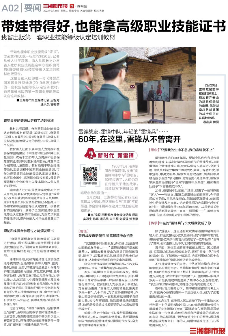 2月21日,省內知名媒體三湘都市報紙質版A02版面刊發《帶娃帶得好,也能拿高級職業技能證書》文章,從育嬰員教材、培訓、考核、技能等級認定