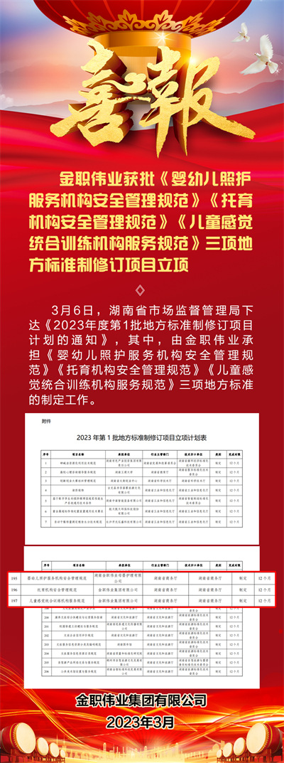 3月6日,湖南省市場監督管理局下達《2023年度第1批地方標準制修訂項目計劃的通知》,其中,由金職偉業承擔《嬰幼兒照護服務機構安全管理規