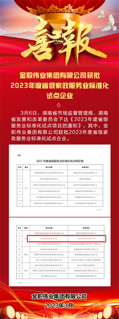 3月6日,湖南省市場監督管理局、湖南省發展和改革委員會下達《2023年度省級服務業標準化試點項目的通知》,其中,金職偉業集團有限公司獲批