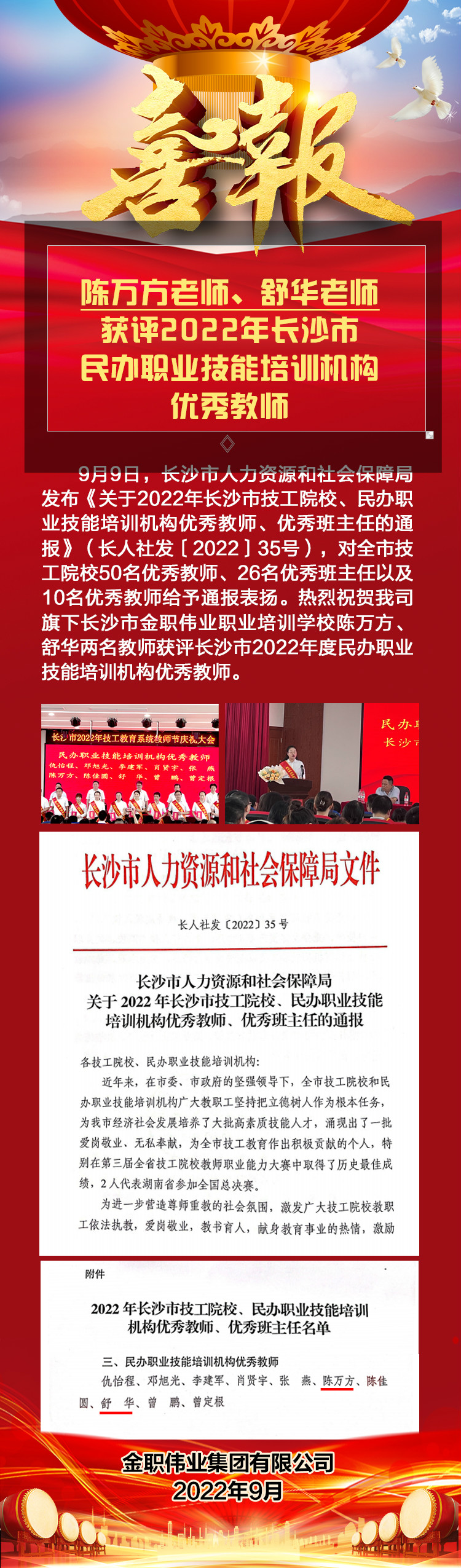 2022年9月9日,長沙市人力資源和社會保障局舉行長沙市2022技工教育教師節慶祝大會,對全市技工院校50名優秀教師、26名優秀班主任以及10名優