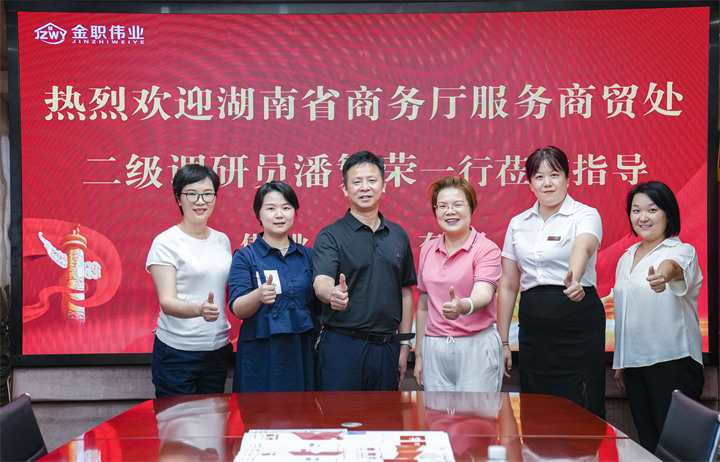 8月13日,湖南省商務廳服務商貿處二級調研員潘繁榮、湖南省家庭服務業協會秘書長楊飛、今日女報·風網資深記者王沁蓉一行蒞臨金職偉業,就