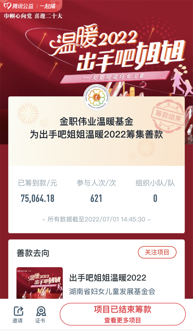 6月30日,出手吧姐姐, 溫暖 2022——關愛困境婦女兒童募捐活動圓滿結束,金職偉業溫暖基金戰隊共籌集到善款75000余元。5 月 31 日,
