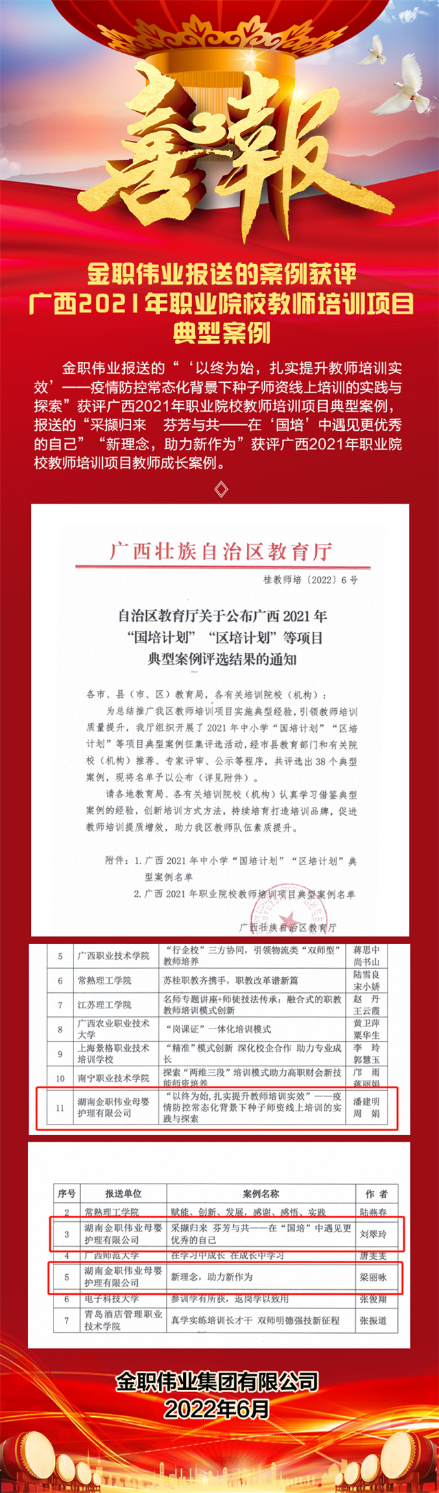 近日,廣西壯族自治區教育廳發布《關于廣西2021年國培計劃區培計劃等項目典型案例評選結果的公示》,金職偉業報送的‘以終為始,扎實