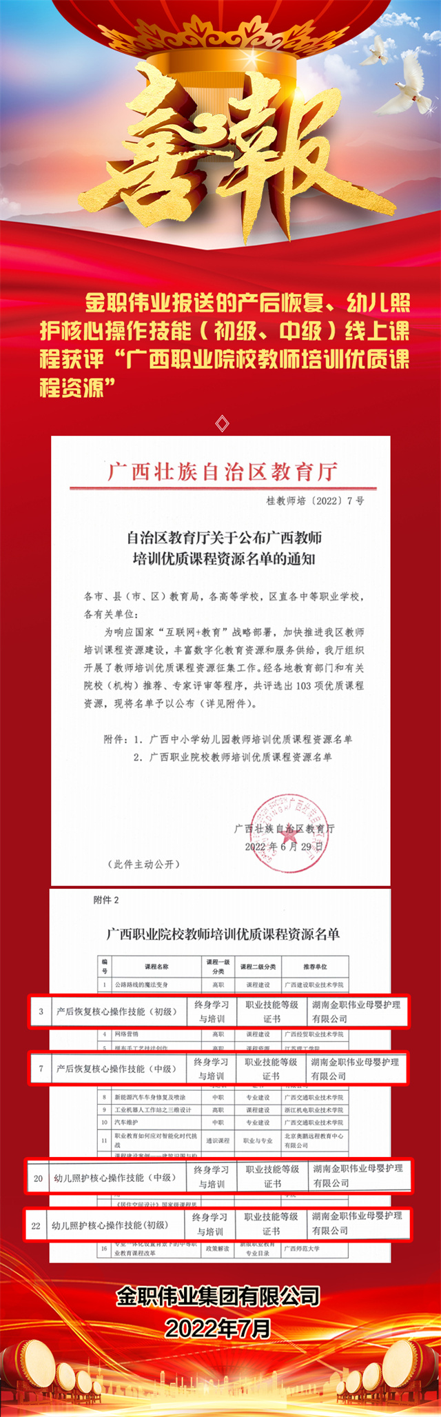 近日,廣西壯族自治區教育廳印發《關于公布廣西教師培訓優質課程資源名單的通知》,金職偉業報送的產后恢復、幼兒照護核心操作技能(初級、