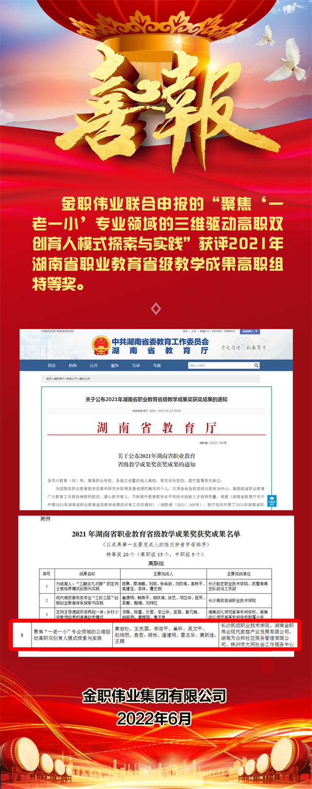 近日,湖南省教育廳發布《關于公布2021年湖南省職業教育省級教學成果獎獲獎成果的通知》,金職偉業與長沙民政職業技術學院、湖南萬眾和社區