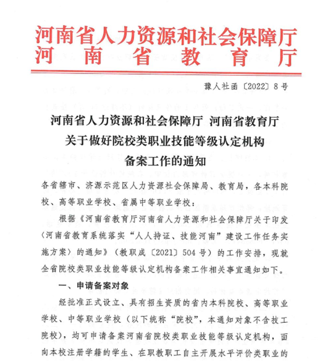 近日,在“人人持證 技能河南”的政策大背景下,河南省人力資源和社會(huì)保障廳、河南省教育廳發(fā)布《關(guān)于做好院校類評(píng)價(jià)機(jī)構(gòu)備案工作的通知》,公布1+X職業(yè)技能等級(jí)證書、人社部244個(gè)職業(yè)