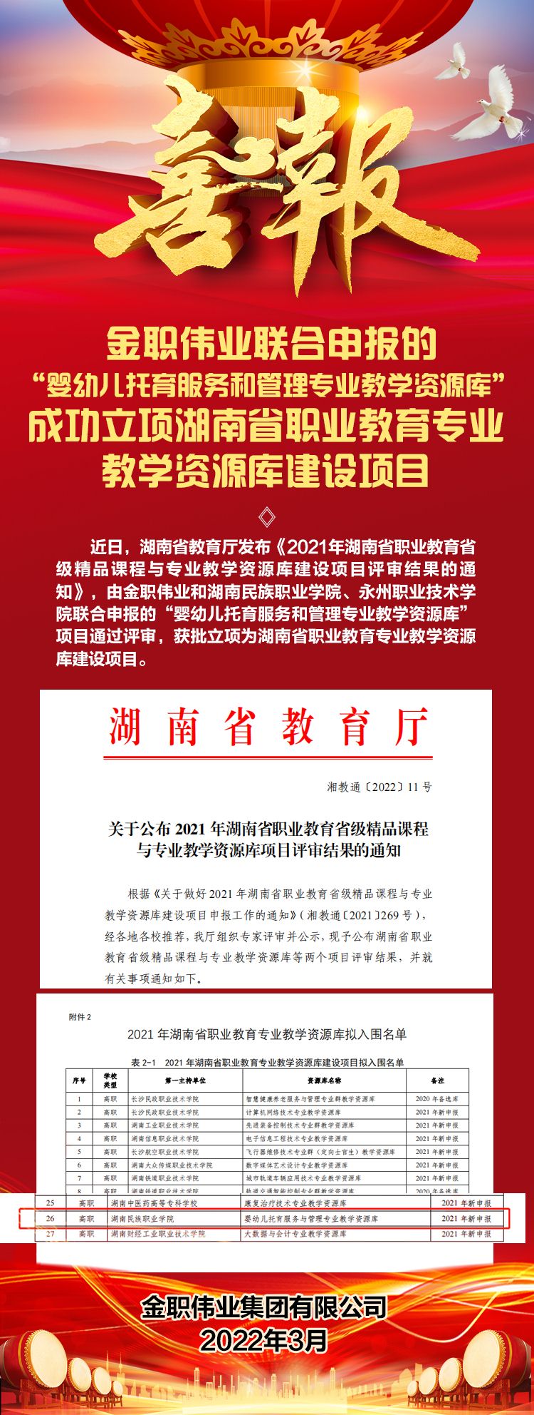 近日,湖南省教育廳發布《2021年湖南省職業教育省級精品課程與專業教學資源庫建設項目評審結果的通知》,由金職偉業和湖南民族職業學院、永州職業技術學院聯合申報的“嬰幼兒托育服