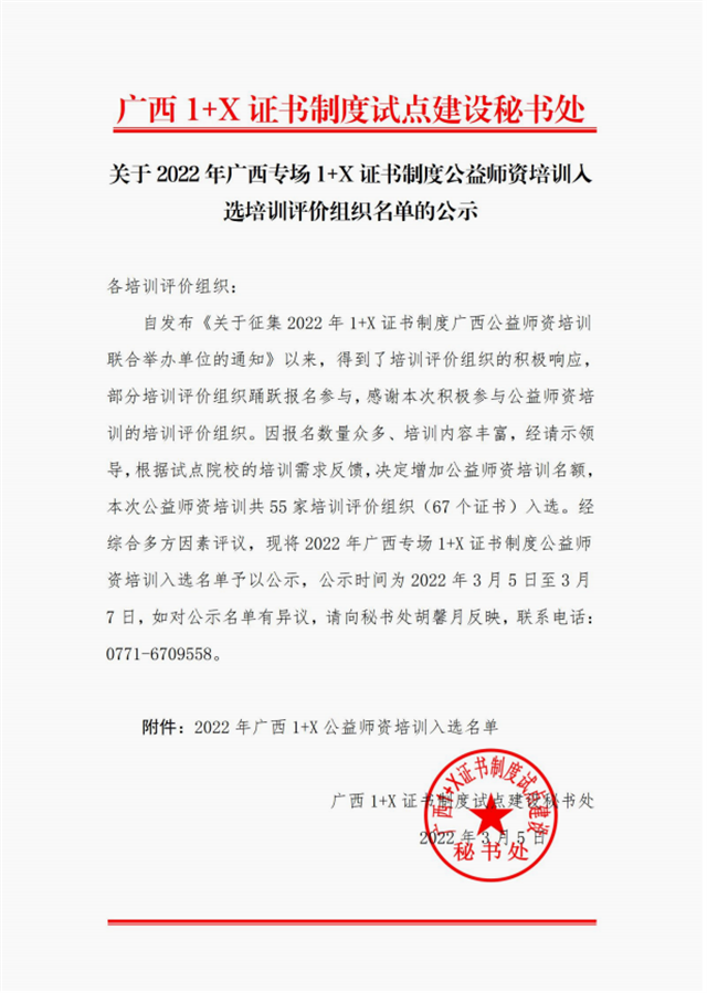 為加速推進1+X證書制度試點落地,3月5日,廣西1+X證書制度試點建設秘書處發布《關于2022年廣西專場1+X證書制度公益師資培訓入選培訓評價組織名單的公示》