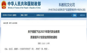 近日,財政部、教育部發布《關于提前下達2021年現代職業教育質量提升計劃資金預算的通知》(以下簡稱《通知》)。