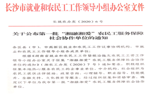 長沙市就業和農民工工作領導小組辦公室發布《關于公布第一批“湘融湘愛”農民工服務保障社會協作單位的通知》,金職偉業成功入選第一批“湘融湘愛”農民工服務保障社會協作單位。