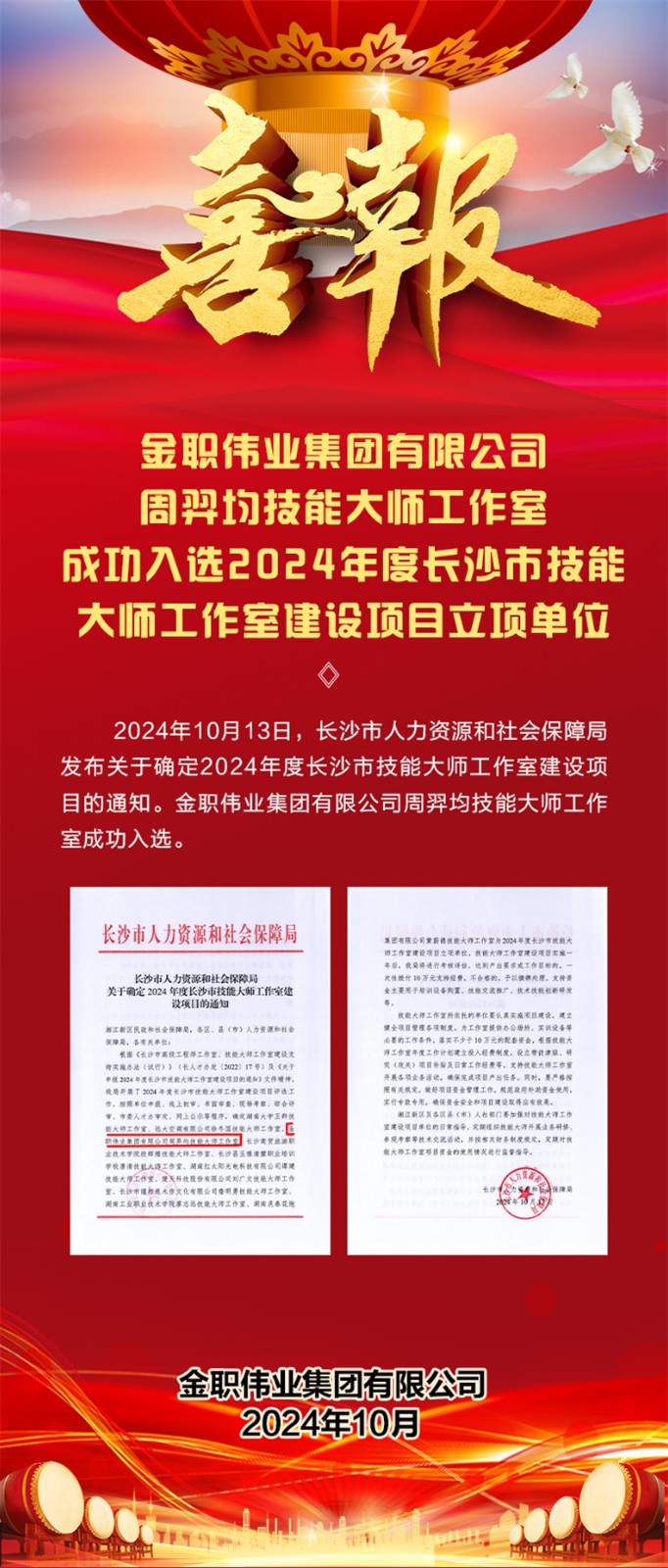 2024年10月13日,長(zhǎng)沙市人力資源和社會(huì)保障局公布2024年度長(zhǎng)沙市技能大師工作室建設(shè)項(xiàng)目名單,金職偉業(yè)集團(tuán)有限公司周羿均技能大師工作室成