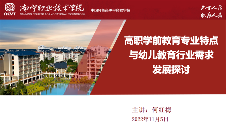 11月5日,金職大講堂第九期第48講正式開(kāi)講,課程邀請(qǐng)到南寧職業(yè)技術(shù)學(xué)院何紅梅教授以高職學(xué)前教育專業(yè)特點(diǎn)與幼兒教育行業(yè)需求發(fā)展探討為主