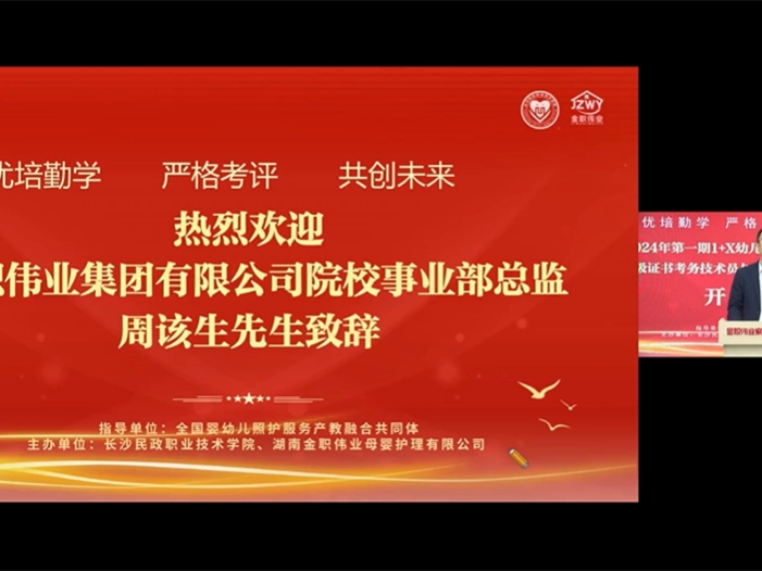 4月12日,2024年第1期幼兒照護及產后恢復考務技術及督導員換證線上培訓班正式開班,金職偉業集團有限公司院校事業部總監周該生出席開班典禮