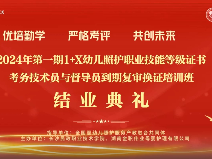 4月24日,2024年1+X幼兒照護職業技能等級證書第五期師資及考評員培訓班正式收官,金職偉業總經理潘建明出席結業典禮。
