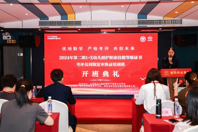 4月16日,2024年第2期幼兒照護及產后恢復考務技術及督導員培訓在長沙舉行開班典禮。金職偉業集團有限公司院校事業部副總監易斌出席典禮,來