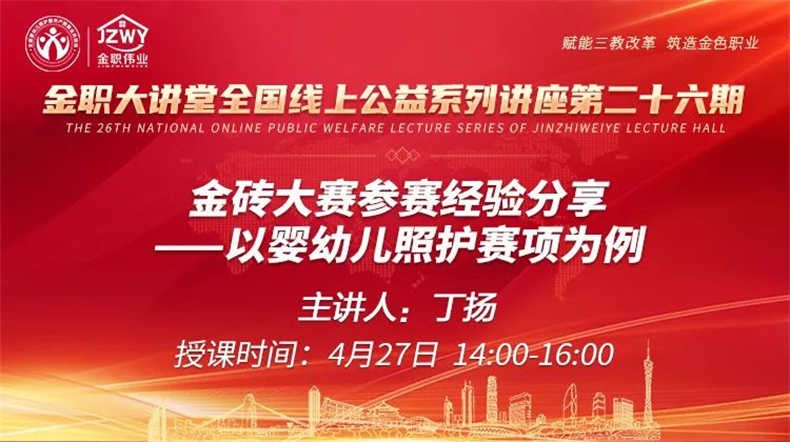 4月27日,金職大講堂第122講正式開講,金職偉業邀請到岳陽職業技術學院丁揚老師來到直播間,作《金磚大賽參賽經驗分享——以嬰幼兒照護賽項為例》主題授課。